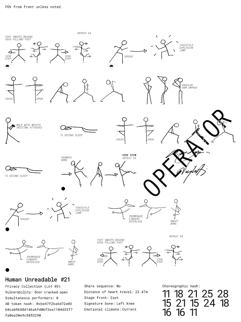 Merve Güven Özkerim: Human Unreadable, which you describe as “an experiential artwork in three acts that begins on Art Blocks and ends in a live performance,” unfolds like a dynamic process. That is that rather than an implementation of fictional pre-defined parts from the beginning, due to on-chain generative choreography there is a strong processual aspect. Is there any software, hardware or any other technological optimizations that take place between Act I, Act II and Act III?